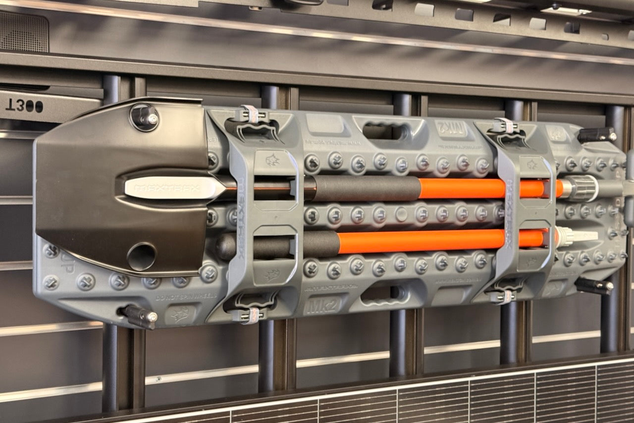 Mounting board with folding pins, supplied with a pair of Maxtrax recovery boards and a Maxtrax recovery shovel kit. Mounted and set up as part of the rack, providing a complete, ready to use recovery setup stored overhead.